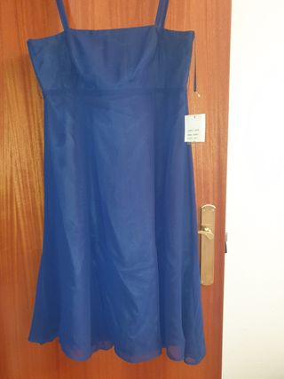 vestido de firma con vuelo, con un azul muy elegante. es de caida como gasa.se podria dejar palabra de honor( sin tirantes)sirve para eventos y celebraciones como bautizo, comunion, boda. tambien para cotillon o nochevieja.talla 42/44