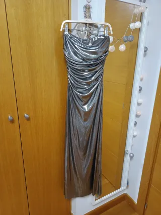 Vestido largo elástico de Stradivarius. Talla real S/M - Escote palabra de honor - Diseño drapeado. - Tejido brillante. - Ideal ocasiones especiales, cena de Navidad o Nochevieja.