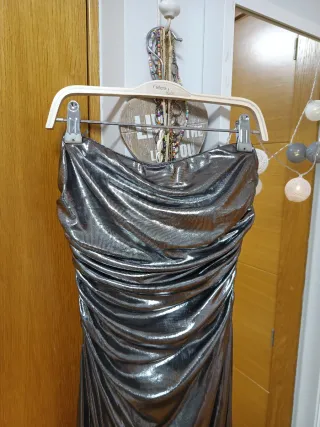 Vestido de Nochevieja gris plateado con una apertura en la parte baja del vestido, con la espalda descubierta y ajustado. Solo se ha puesto una vez.