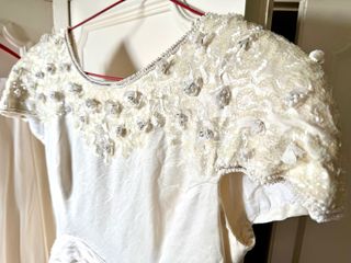Vestido de novia blanco roto, con solo unas horas de uso en Mayo de 2024, con pedrería, de manga al codo, hombreras extraíbles. Escote no muy bajo y apertura central no más alta de la rodilla. Para personas de altura media. Vestido muy cómodo, sin transparencias. Limpio de tintorería. Regalo tiara. Atiendo wasap. Te lo puedes probar sin compromiso.
