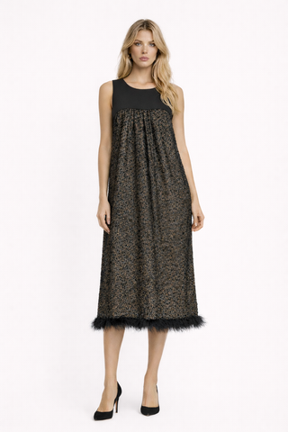 Vestido nuevo sin uso (estado impecable). Diseño midi con parte superior lisa negra y cuerpo en tejido brocado negro con hilo dorado (efecto lujo). Acabado con bajo de plumas que le da un toque súper especial. ✅ Corte cómodo y elegante (tipo evasé/recto suelto) ✅ Textura brocada con brillo sofisticado ✅ Plumas en el bajo (detalle “statement”) ✅ Cierre trasero con cremallera Ideal para coctel, cena, evento, Navidad, fiesta, boda civil, invitada. 📦 Envío por Wallapop o entrega en mano. Puedo pasar medidas por mensaje. 💘 Promo San Valentín: reservándolo antes del 14/02, te hago descuento especial.
