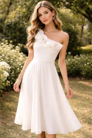 Vestido elegante de un solo hombro, ideal para una boda civil. Presenta un diseño con volantes y un cinturón a juego. - Diseño asimétrico con volante. - Cinturón de tela para ajustar la cintura. - Falda con detalle de volantes en el bajo.