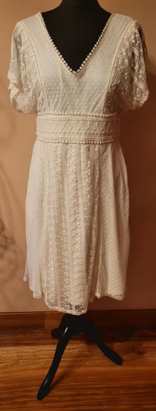 Opción de prueba.Mido 1,58 m peso 54kg.por 10€ más zapatos talla 37 rosa palo( puestos ese día sólo) Usado una vez para boda civil Queda precioso.Vestido blanco de encaje con un diseño delicado y elegante. - Escote redondo con detalle de pompones. - Espalda con escote en V y cierre de cremallera. - Bajo con acabado festoneado. - Tejido de encaje floral.