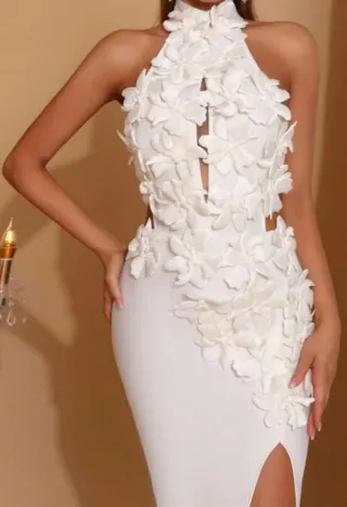 Elegante vestido blanco, ideal para bodas civiles o fiestas especiales. - Diseño halter con detalles florales. - Corte cut-out en el torso. - Falda con abertura lateral.