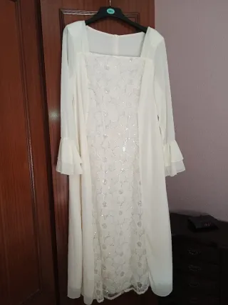Vestido nuevo bordado, un regalo, pero nunca usado por no corresponder la talla, es 40,42 o 44, adaptable. Está impecable como se puede ver en las fotos. Es muy muy bonito. Se puede hacer una idea de como queda viendo la ultima foto de la modelo.