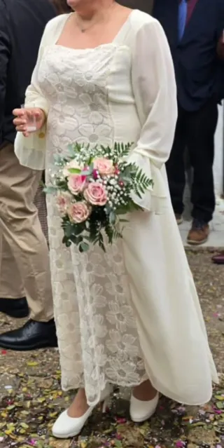 Precioso vestido de novia civil de la marca Lady Pipa, en color marfil y talla XL (yo utilizo talla M/L). Es un diseño elegante y sofisticado, ideal para una boda civil o una celebración especial. Perfecto estado, utilizado unas horas. - Escote palabra de honor. - Mangas tres cuartos de tul transparente. - Corte ajustado que se adapta a la silueta. - Falda midi y fluida.