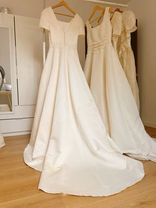 Vestido de novia estilo vintage romántico en color marfil con bordado y pedrería en la parte superior. Incluye cola desmontable a juego, que permite dos estilos: ✨ vestido más sencillo sin cola ✨ look completo más ceremonial con cola Escote bordado con detalles delicados y botones traseros. Diseño elegante y atemporal, ideal para: • novia estilo vintage o boho • boda civil o íntima • sesión fotográfica o estilismo Tejido ligero con bonita caída. Se vende tal como aparece en fotos. Recogida en Barcelona. Vestido de novia vintage con un diseño romántico y elegante. La cola es desmontable, ofreciendo versatilidad. - Adornado