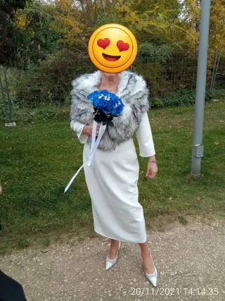 Elegante vestido para boda civil. - Diseño sencillo y largo midi. - Manga francesa o 3/4 con perlitas en los hombros. - Escote cuadrado. - Incluye chal de pelo sintético blanco y gris con broche. También broche y 2 horquillas para recogido.