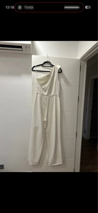 Mono elegante de Green Coast en color blanco. Diseño asimétrico con un hombro al descubierto y drapeado. - Corte recto en las piernas. - Tejido fluido. - Perfecto para una fiesta, boda o incluso Vestido de Novia civil. Está en muy buen estado, solo tiene unas pelotitas a nivel del ombligo, se pueden quitar con máquina despelusar pero sinceramente no me había dado cuenta hasta hacer las fotos o sea no se notan puesto.
