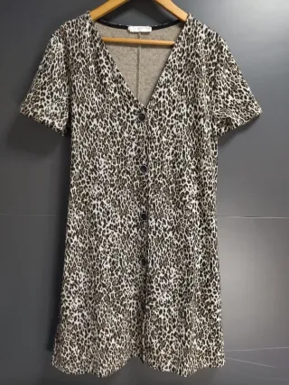 Vestido de Mango con un llamativo estampado de leopardo. Ideal para añadir un toque salvaje a tu armario. - Diseño con cuello en V. - Cierre de botones en la parte delantera. - Manga corta, pero tela gordita, para invierno o entretiempo.