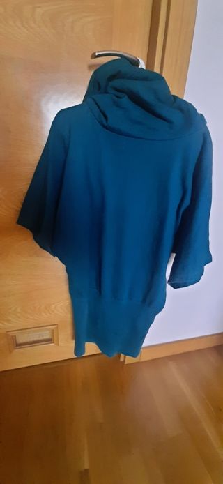 Jersey- vestido ancho por arriba, con maga tres cuartos ancha y cuello muy grande (pero cómodo). Es de tela de sudadera gordita. La parte de abajo es estrecha y fina. Se puede llevar como jersey holgado o como vestido con falda elastica. Es de color azul petróleo.