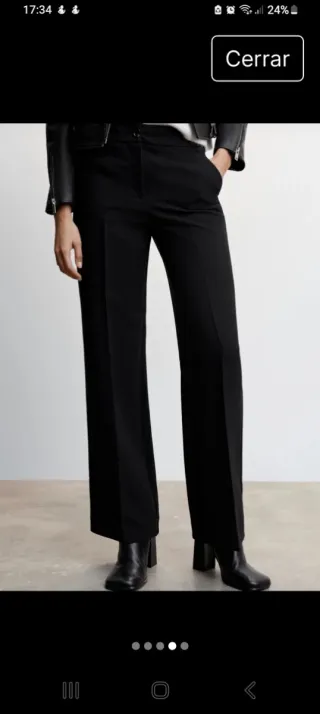 Pantalón de vestir de crepe negro. Lleva pinzas, bolsillos laterales, y 2 aberturas simuladas detrás. También lleva trabillas para poner cinturón. Está recién llevado a la tintorería. Mide 37 cm de cintura y 100 cm de largo. Tiene una caída muy bonita. Se puede llevar con una americana que también vendo de crepe negro más gordito y queda ideal.