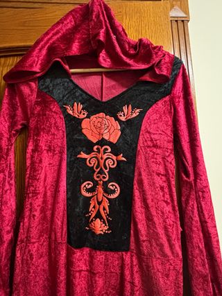 Vestido largo de terciopelo rojo con capucha y un bordado central. Mangas largas acampanadas. Ideal para disfraz teatro, medieval, halloween, etc. Equivale a una talla 38.