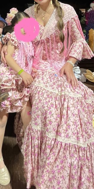 Conjunto de vestidos de flamenca a juego para madre e hija. Un diseño encantador para ocasiones especiales. - Estampado floral en tonos rosas y puntilla beige, falda con bastante volumen. -Flecos rosas se venden a parte, iguales madre e hija. - Mujer talla xs/s tiene para sacar. -Niña talla de 3 a 5 años tiene para sacar.