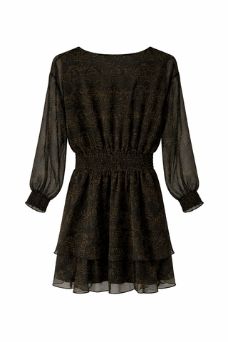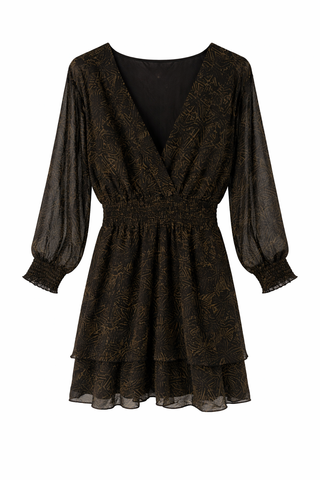 Vestido negro con flores de tonos marrones. Tiene un cinturón que hace que se marque la figura y gomas en las muñecas que le da forma al final de la manga.