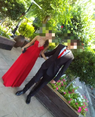 Precioso vestido largo, ideal para una boda o evento especial. Luce elegante y sofisticado. -Chal rojo a juego. - En el bajo tiene goma para podertelo recoger en la muñeca. - Adorno de pedrería en el escote y cruzado por la espalda . -Cuerpo del escote preformado para poder ir sin sujetador. - Caída fluida y favorecedora. -Posibilidad de venir a probarselo en persona si es de Madrid.