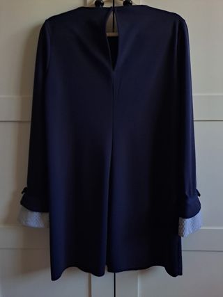 Vestido corto de manga larga de Zara. Color azul marino con silueta evase o linea A. Talla M. Costura central de arriba abajo tanto en el derecho como en el reverso, cuello redondo y cierre en la espalda abierto cerrado con un botón. Mangas rectas con puños acampanados tipo camisa a rayas blancas y azul marina rematada con un lazo a la altura de la muñeca.