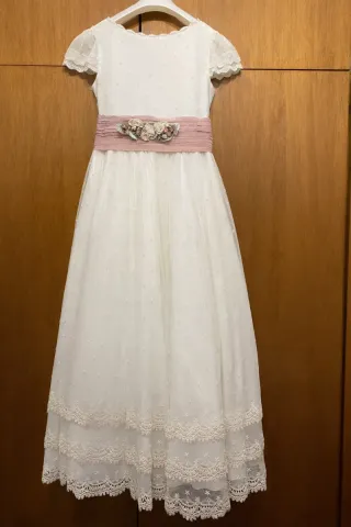 Vestido de comunión para el año 2025. Un diseño elegante y delicado. - Cuerpo con detalles de puntitos. - Fajín rosa con aplicaciones florales. - Mangas cortas con encaje. - Falda larga de tul con puntitos. - Perfecto para una niña delgadita de unos 130-140 cm - Se puede entregar en mano en Valencia o Albacete - Usado solo el día de la comunión