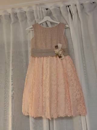 Vestido de comunión para niña, talla 9/10. Un diseño elegante y delicado. - Tejido con finas rayas doradas. - Detalle de lazo y adorno floral en la cintura. - Falda con vuelo y forro interior.