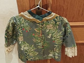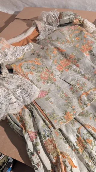 Vestido tradicional de fallera para niña, de 9 a 12 años mangas de farol y manguitos para hacer manga larga - Tejido brocado con motivos florales. - Adornos de encaje en cuello y mangas. - Forro interior de color naranja.
