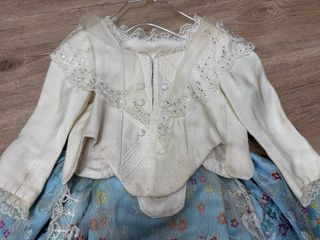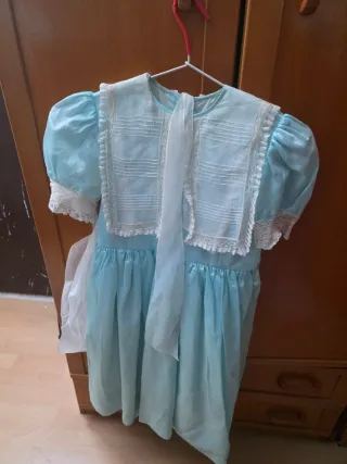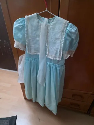 Vestido faldera niña 3-5 años ( según niña ). Falda azul con lazo rosa y corpiño blanco roto , se vende con manteletas incluidas y de regalo el cancan , que los corchetes están cosidos para luego unirlo con falda y es mucho más cómodo , el vestido está en buen estado.