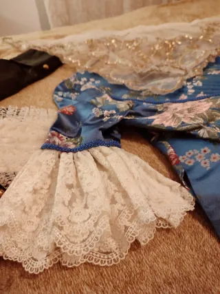 Traje de fallera de niña, en azul claro. Solo tiene 3 puestas debido a la pandemia. - Con zapatos de varias tallas. - Tela para forrar zapatos. - Manteletas en plata. - Cancán/ahuecador. * También tengo las peinetas y el aderezo pero se venden a parte.