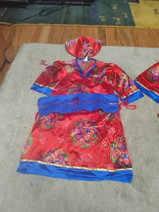 Disfraz de china para niña, con un diseño vibrante y llamativo. - Estampado de dragones y nubes. - Incluye gorro a juego. - Cinturón azul con detalles brillantes.