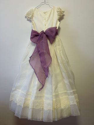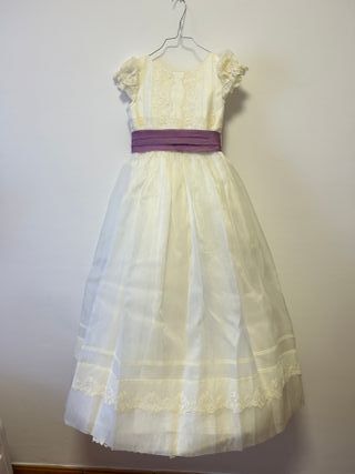Vestido de comunión para niña, elegante y delicado, en seda natural. Color marfil con lazo violeta - Cancán - Zapatos Talla 35 - Cuerpo con detalles de encaje. - Fajín de tela violeta. - Falda vaporosa con varias capas. - Adornos de encaje en el bajo. - Diademas - Guantes - Calcetines
