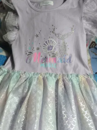 Precioso vestido con temática de sirena, perfecto para ocasiones especiales o para jugar. - Cuerpo lila con detalles brillantes. - Falda de tul con efecto iridiscente y destellos. - Mangas cortas con volantes. - Diseño de sirena y conchas en el pecho.