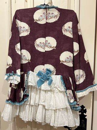 Vestido de fallera para niña, con un bonito estampado floral sobre fondo azul. Incluye detalles de encaje blanco en las mangas. - Diseño con flores y ramas. - Mangas con volantes de encaje. - Adorno de pasamanería azul en el cuello y puños. Usado unas 10 veces.