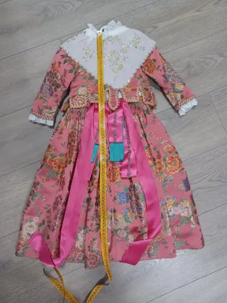 Traje de fallera para niña, nuevo y sin estrenar. - Talla aproximada para 3 a 5 años. - Diseño multicolor con predominio del rosa. - Incluye detalles bordados dorados.