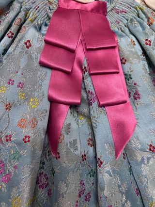 Vestido tradicional de Fallera para niña, con un diseño elegante y festivo. - Tejido principal en tono azul. - Detalles florales en rosa y blanco. - Adornado con encaje blanco. - Incluye banda y broche decorativo.
