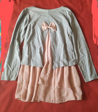 Vestido camiseta con un detalle de malla de tul en la parte inferior. Es una prenda versátil y cómoda. - Diseño tipo camiseta. - Falda de tul. - Color beige y blanco. Es la talla 14 de niña pero vale para una S o XS de mujer