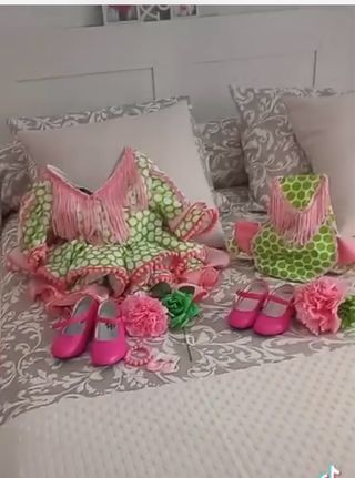 Conjunto de vestidos de flamenca para niña. - Diseño con lunares verdes y detalles rosas. - Adornos de flecos en el escote y mangas. - Volantes en el bajo.ranita bebe desde 6/12 meses y vestido igual 4/5 años 350 los 2 tambuen los vendo por separado preguntar precios