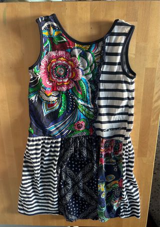 Vestido de niña con un diseño patchwork muy colorido y original. De la marca Desigual, talla 9-11 años (134-140cm) - Estampado floral grande en la parte superior. - Combinación de rayas y estampados. - Tirantes.