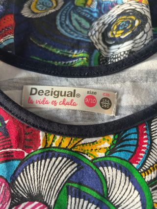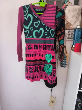 Vestido de la marca Desigual, ideal para niñas de 7 a 8 años. Nuevo sin estrenar. - Diseño patchwork con estampados florales y geométricos. - Cuello cruzado. - Cinturón rosa. - Tejido ligero y cómodo.