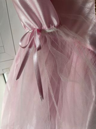 Vestido de fiesta rosa con detalles florales y lazo. Perfecto para un disfraz de princesa - Diseño con varias capas en la falda. - Cola larga en la parte trasera. - Adornos de flores en relieve.