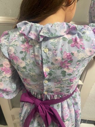 Vestido de fiesta para niña con un diseño floral delicado. - Cuello con volantes. - Cierre de botones en la espalda. - Cinturón de tela a juego. Talla 10 años 140 cm