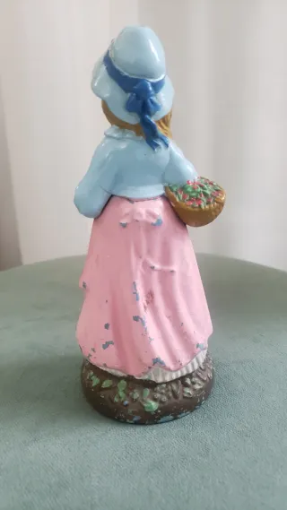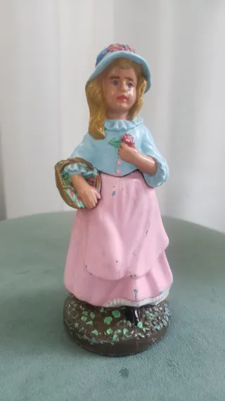 Figura decorativa de una niña con sombrero y cesta, parte de la colección de botellas de colonia de Avon. 1970 - Diseño de niña con vestido rosa y blusa azul. - Sostiene una cesta en una mano y una flor en la otra. - Base con diseño de hierba.
