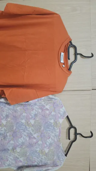 Conjunto de dos camisetas para niña. - Camiseta naranja lisa. - Camiseta con estampado floral en tonos pastel.