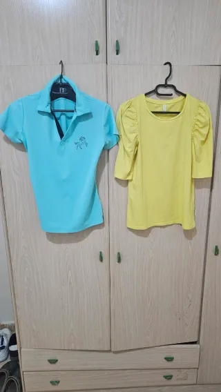Conjunto de dos camisetas para niña. - Camiseta azul claro tipo polo con detalle de bordado. - Camiseta amarilla con mangas abullonadas.