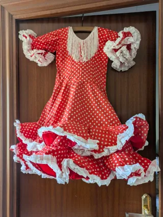 Vestido de flamenca para niña con un diseño alegre y tradicional. Buena calidad. Años 70. - En algodón estampado de lunares blancos sobre fondo rojo. - Volantes en mangas y falda. - Adorno de flecos en el cuello. - Interior con falda roja rigida para dar cuerpo Medidas: Largo:74 cm. Cintura: 55 cm. En la cintura tiene 7 cm. para sacarle largo.