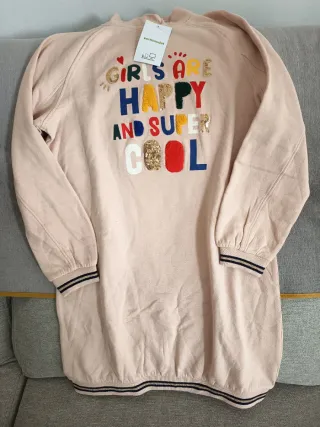 Vestido de niña de la marca Verbaudet, sin estrenar. - Diseño con texto GIRLS ARE HAPPY AND SUPER COOL. - Detalles de lentejuelas. - Puños y bajo con banda elástica y rayas. - Color rosa pálido.