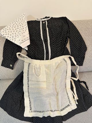 Conjunto de traje de casera para niña de 3 años. Incluye vestido, delantal y cofia. - Vestido negro con estampado floral blanco. - Delantal blanco de lino con detalles de encaje. - Cofia blanca con estampado floral.