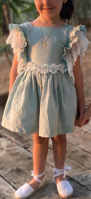 Precioso vestido de comunión para niña, en color beige con detalles en verde agua. no tiene talla, hecho a medida para una niña de 1,55 cm altura y comprexion gruesa, costo 400€. - Vestido de talle alto. - Cintura marcada con lazo. - Falda amplia y vaporosa. - Sin mangas.