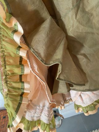 Vestido de flamenca / sevillana / farales, de modista en tela salmon con mini lunares blancos y pistacho con cintas a juego y precioso volantes bordadas de organza. 31 cm de ancho la cintura y 123 cm aprox de hombro a bajo. Lista para la feria de Sevilla 💃🏻