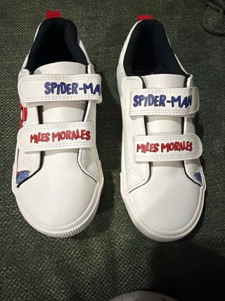 Zapatos infantiles con diseño de Spiderman. Talla 33 están sin usar. - Cierre de velcro. - Detalle de Spiderman en el lateral. - Nombre SPIDER-MAN en azul.