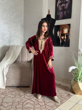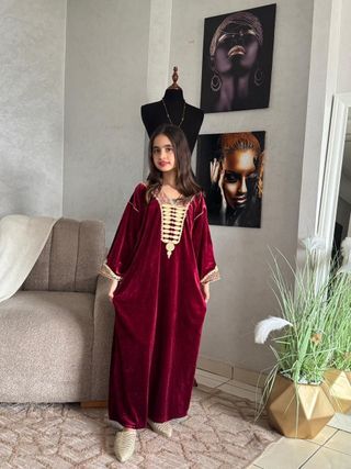 Caftán de terciopelo para niña, con un largo de 127 cm. Presenta un diseño elegante con detalles bordados. - Tejido de terciopelo suave. - Adornos dorados en cuello y mangas.