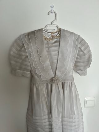 Vestido de comunión para niña con un diseño elegante y delicado. - Tejido con rayas horizontales transparentes. - Cuello con volantes festoneados. - Detalle floral en la cintura. - Mangas abullonadas.