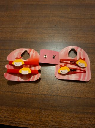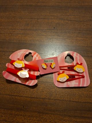 Conjunto de accesorios para el cabello y pendientes con un diseño infantil. - Procedente de cierre de negocio. - Incluye gomas y horquillas. - Incluye un par de pendientes con palo y cierres de plata de ley. - Diseño en madera de niña con pelo rubio y vestido.